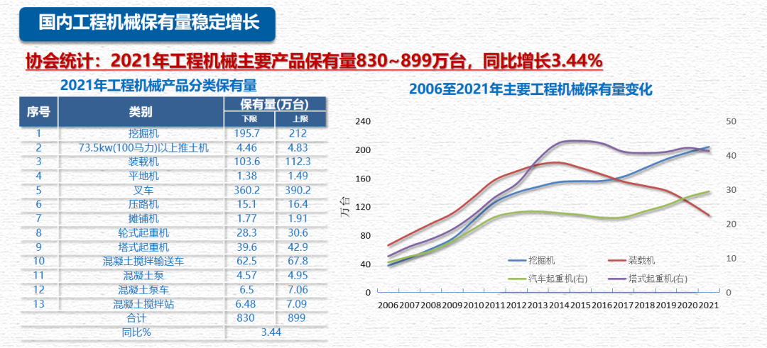到2021年工程器械主要產(chǎn)品保有量已經(jīng)接近了830-899萬臺,同比增長了3.44%。