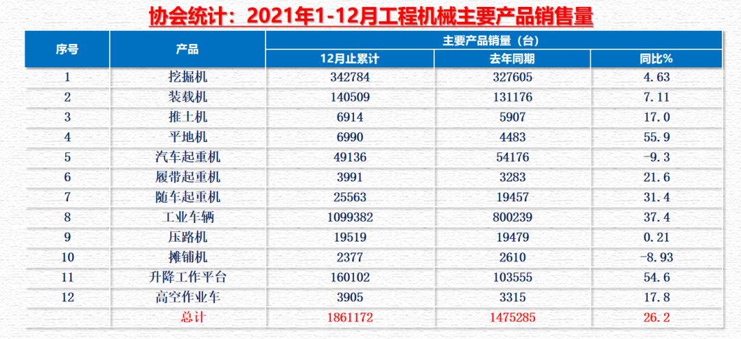 就納入?yún)f(xié)會統(tǒng)計的十二類產(chǎn)品數(shù)據(jù)顯示。2021年累計銷售產(chǎn)品1861172臺,同比26.2%,其中挖掘機342784臺,同比26.2%。