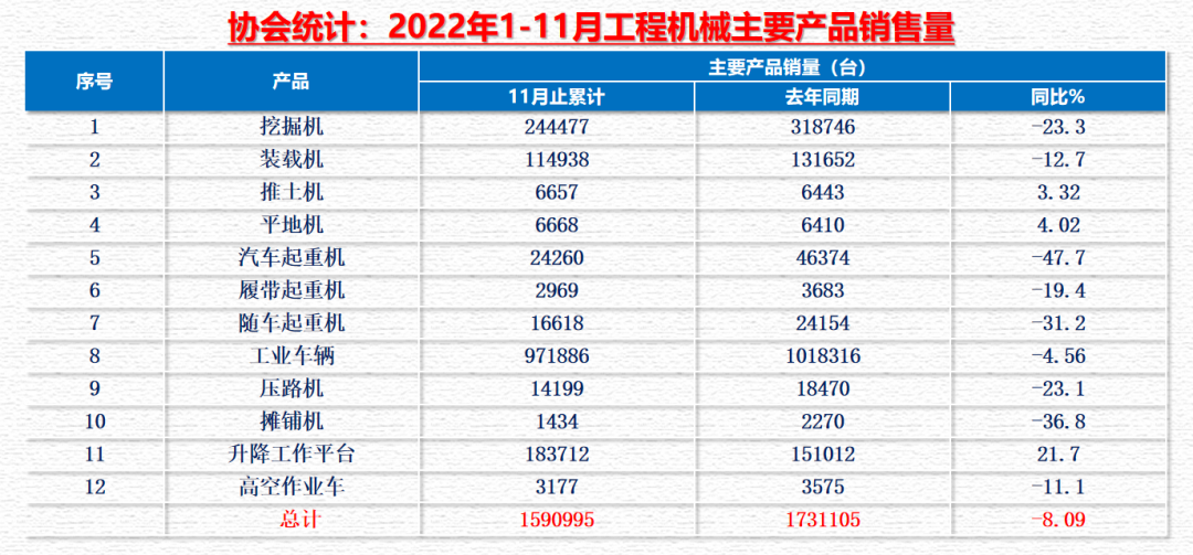 2022年1-11月,累計銷售1590995臺,同比下降8.09%,其中挖掘機244477臺,同比下降23.3%。